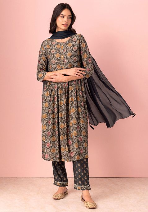 Grey Printed Gathered Cotton Kurta With Pants And Dupatta (Set of 3)