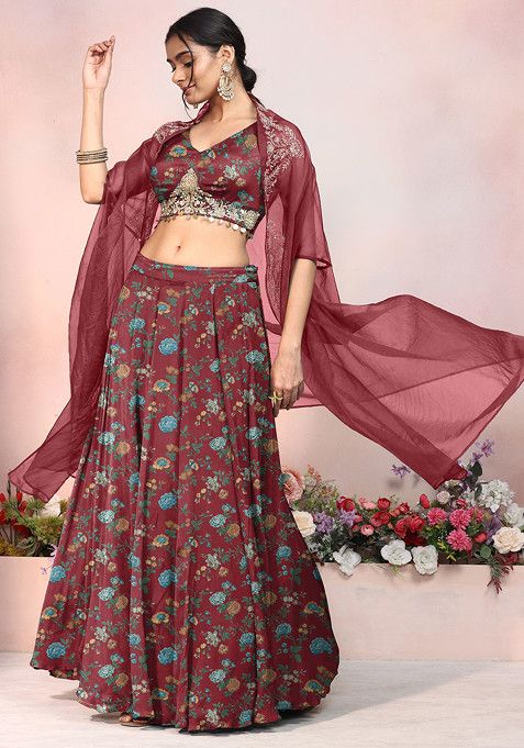 Maroon Lehenga Set With Zari Sequin Hand Embroidered Blouse And Jacket