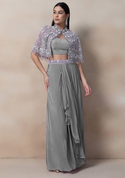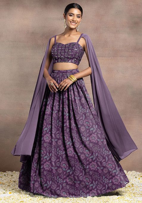 Purple Lehenga Set With Swarovski Hand Embroidered Cape Sleeve Blouse