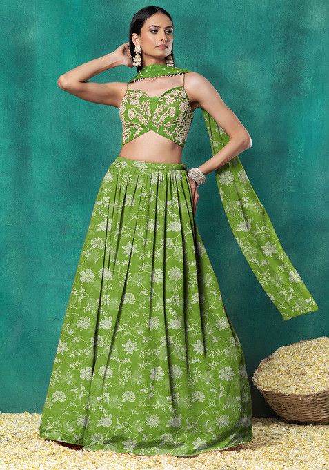 Lime Green Lehenga Set With Floral Pearl Hand Embroidered Blouse And Choker Dupatta