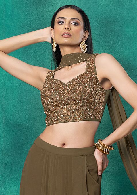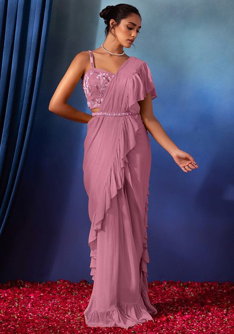 Dull Pink Pre-Stitched Saree Set With Floral Hand Embroidered Blouse And Belt