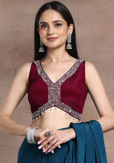 Crimson Red Sequin Pearl Hand Embroidered Blouse