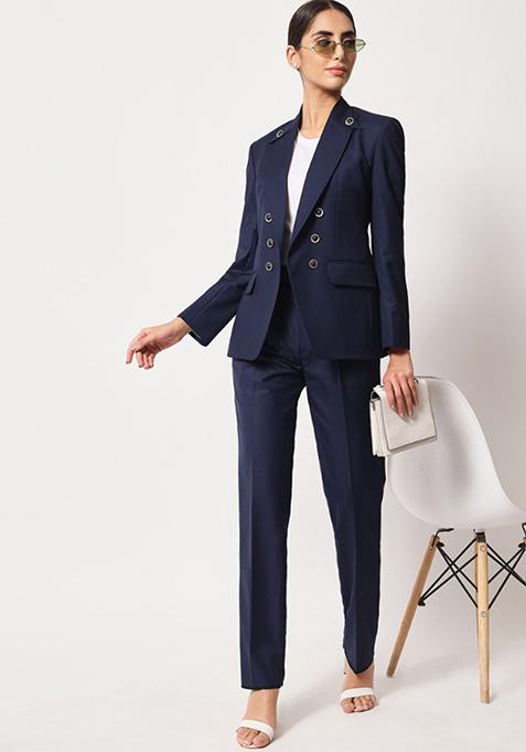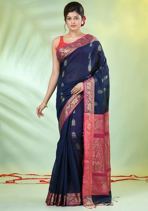 Navy Blue Ethnic Motifs Cotton Blend Saree Set