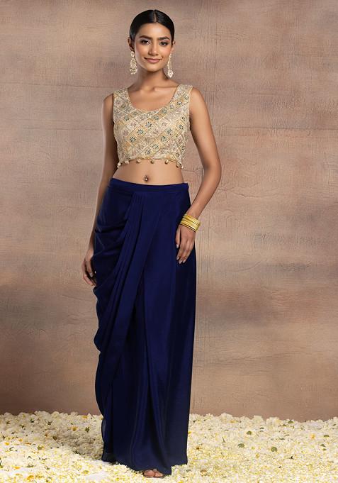 Indigo Blue Draped Lehenga Set With Gold Dori Sequin Hand Embroidered Blouse And Mesh Jacket