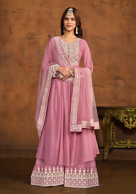 Pink Embroidered Faux Georgette Kurta Set