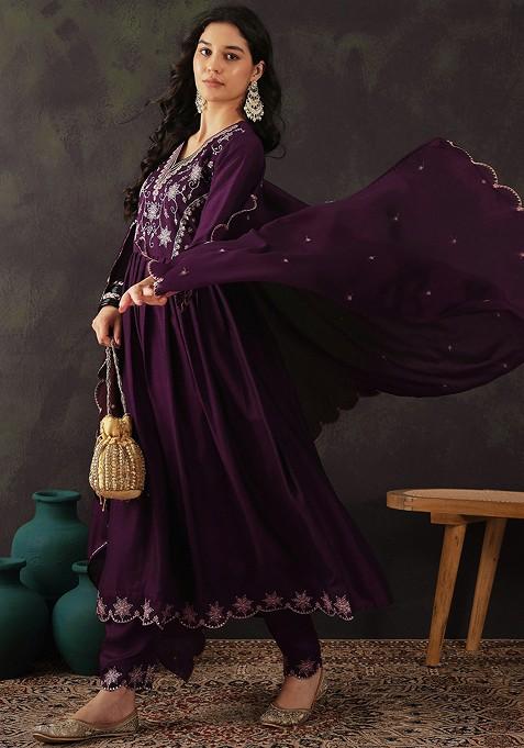 Magenta Zari Sequin Embroidered Vichitra Kurta Set