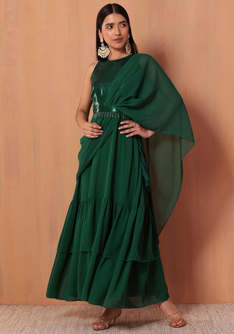 Dark Green Pre-Stitched Saree With Attached Sequinned Blouse And Belt (Set of 2)