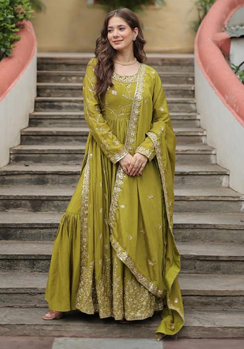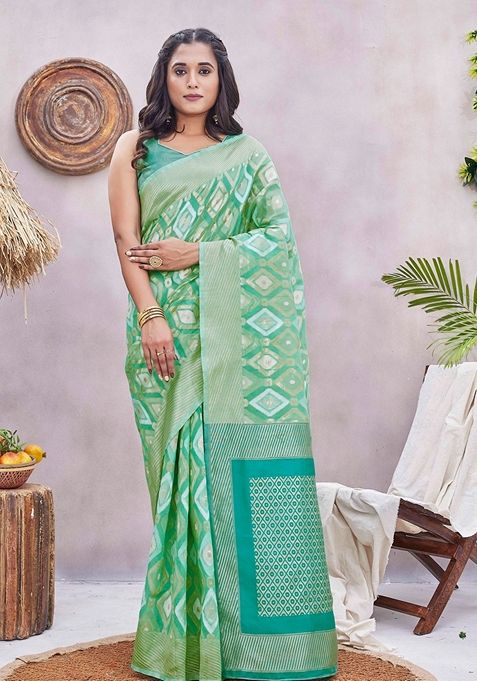 Sea Green Woven Design Embroidered Silk Lehenga Set