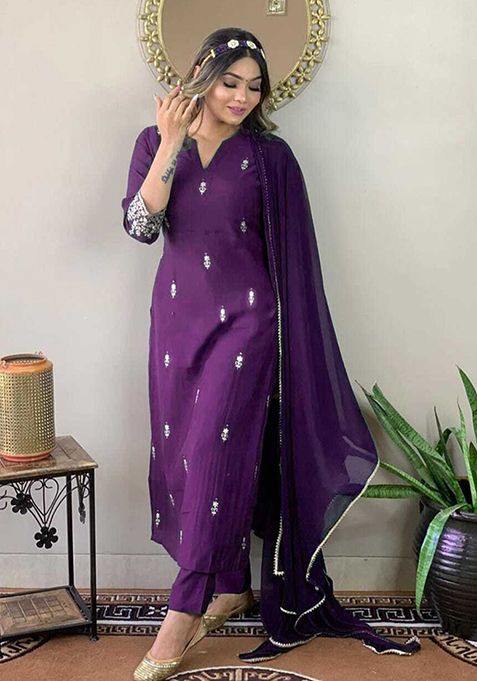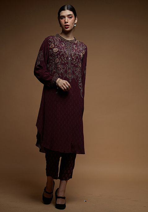 Wine Bemberg Crepe Rhinestones Work Co-ord Set