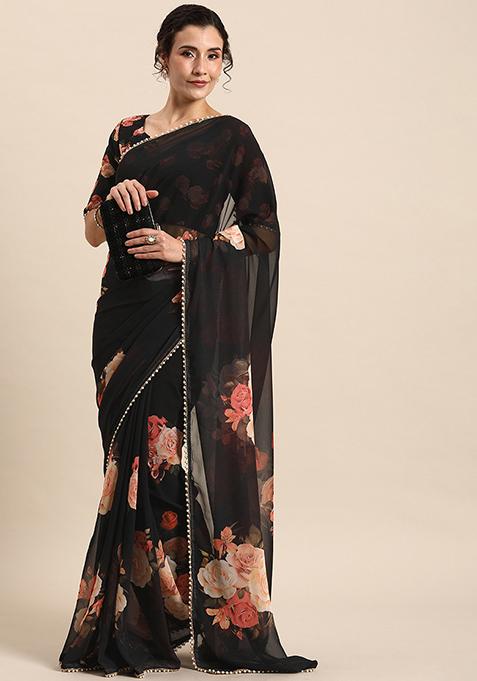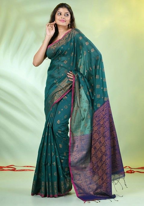 Teal Blue Ethnic Motifs Cotton Blend Saree Set