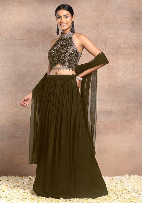 Olive Lehenga Set With Floral Hand Embroidered Halter Blouse And Dupatta