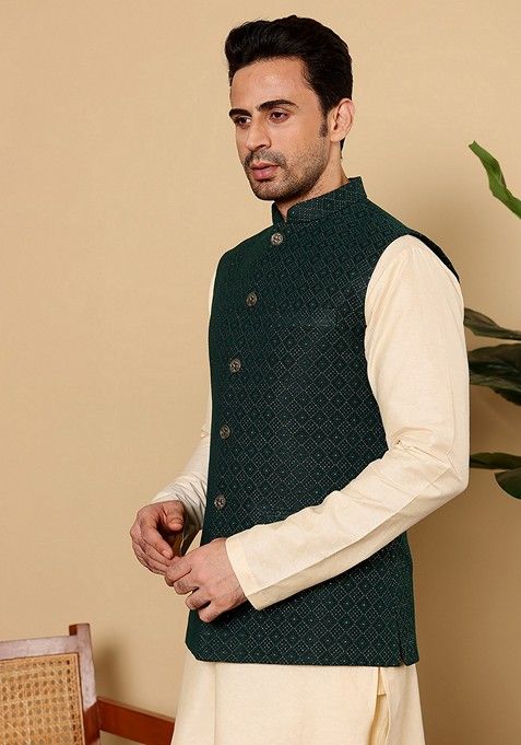 This Black And Green Cotton Silk Nehru Jacket For Men is made from premium fabrics, ensuring comfort while keeping you stylish. Designed to suit all body types, the Black And Green Cotton Silk Nehru Jacket For Men blends tradition with modern aesthetics. Perfect for weddings, parties, and festive occasions, this piece enhances your cultural charm. Experience timeless elegance with our Black And Green Cotton Silk Nehru Jacket For Men, crafted to add a royal touch to your wardrobe. Pair this Black And Green Cotton Silk Nehru Jacket For Men with matching accessories for a complete, graceful look.