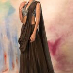 Pair this Copper Flared Palazzo Set With Hand Embroidered Halter Blouse And Attached Drape with matching accessories for a complete, graceful look. Experience timeless elegance with our Copper Flared Palazzo Set With Hand Embroidered Halter Blouse And Attached Drape, crafted to add a royal touch to your wardrobe. This Copper Flared Palazzo Set With Hand Embroidered Halter Blouse And Attached Drape is made from premium fabrics, ensuring comfort while keeping you stylish. Designed to suit all body types, the Copper Flared Palazzo Set With Hand Embroidered Halter Blouse And Attached Drape blends tradition with modern aesthetics. Perfect for weddings, parties, and festive occasions, this piece enhances your cultural charm.