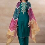 Perfect for weddings, parties, and festive occasions, this piece enhances your cultural charm. This Dark Green Leaf Embroidered Kurta With Pants And Printed Dupatta (Set of 3) is made from premium fabrics, ensuring comfort while keeping you stylish. Designed to suit all body types, the Dark Green Leaf Embroidered Kurta With Pants And Printed Dupatta (Set of 3) blends tradition with modern aesthetics. Pair this Dark Green Leaf Embroidered Kurta With Pants And Printed Dupatta (Set of 3) with matching accessories for a complete, graceful look. Experience timeless elegance with our Dark Green Leaf Embroidered Kurta With Pants And Printed Dupatta (Set of 3), crafted to add a royal touch to your wardrobe.