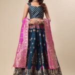Pair this Dark Teal Woven Zari Jacquard Lehenga Set with matching accessories for a complete, graceful look. This Dark Teal Woven Zari Jacquard Lehenga Set is made from premium fabrics, ensuring comfort while keeping you stylish. Designed to suit all body types, the Dark Teal Woven Zari Jacquard Lehenga Set blends tradition with modern aesthetics. Perfect for weddings, parties, and festive occasions, this piece enhances your cultural charm. Experience timeless elegance with our Dark Teal Woven Zari Jacquard Lehenga Set, crafted to add a royal touch to your wardrobe.