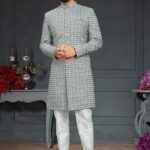Dusty Green Embroidered Jacquard Indo Western Sherwani Set For Men