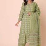 Green Cotton Kurta With Pants And Dupatta (Set of 3)