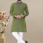This Green Embroidered Jacquard Kurta Set For Men is made from premium fabrics, ensuring comfort while keeping you stylish. Designed to suit all body types, the Green Embroidered Jacquard Kurta Set For Men blends tradition with modern aesthetics. Experience timeless elegance with our Green Embroidered Jacquard Kurta Set For Men, crafted to add a royal touch to your wardrobe. Perfect for weddings, parties, and festive occasions, this piece enhances your cultural charm. Pair this Green Embroidered Jacquard Kurta Set For Men with matching accessories for a complete, graceful look.