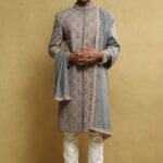 Grey Moti Work Handloom Silk Sherwani Set For Men