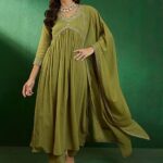 Perfect for weddings, parties, and festive occasions, this piece enhances your cultural charm. Pair this Mehendi Zari Sequin Embroidered Georgette Kurta Set with matching accessories for a complete, graceful look. This Mehendi Zari Sequin Embroidered Georgette Kurta Set is made from premium fabrics, ensuring comfort while keeping you stylish. Experience timeless elegance with our Mehendi Zari Sequin Embroidered Georgette Kurta Set, crafted to add a royal touch to your wardrobe. Designed to suit all body types, the Mehendi Zari Sequin Embroidered Georgette Kurta Set blends tradition with modern aesthetics.