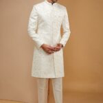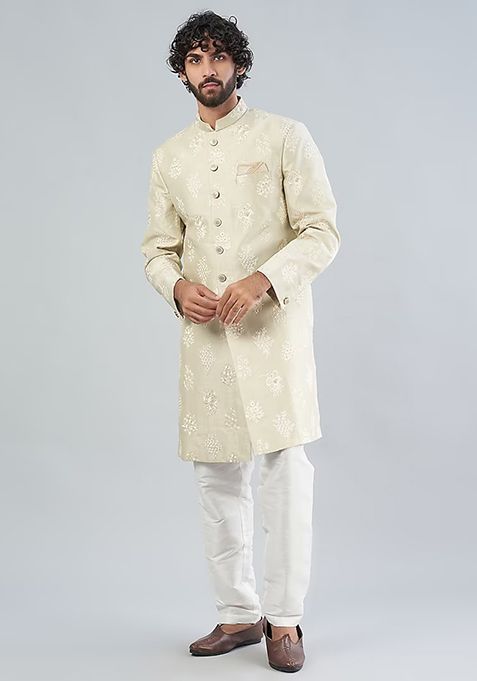Off White Zari Embroidered Sherwani Set For Men