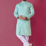 Pair this Sky Blue Hand Work Silk Kurta Set For Men with matching accessories for a complete, graceful look. This Sky Blue Hand Work Silk Kurta Set For Men is made from premium fabrics, ensuring comfort while keeping you stylish. Perfect for weddings, parties, and festive occasions, this piece enhances your cultural charm. Experience timeless elegance with our Sky Blue Hand Work Silk Kurta Set For Men, crafted to add a royal touch to your wardrobe. Designed to suit all body types, the Sky Blue Hand Work Silk Kurta Set For Men blends tradition with modern aesthetics.