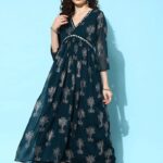 Teal Foil Print Organza Kurta Set