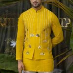 Perfect for weddings, parties, and festive occasions, this piece enhances your cultural charm. Pair this Yellow Hand Embroidered Bundi Jacket For Men with matching accessories for a complete, graceful look. This Yellow Hand Embroidered Bundi Jacket For Men is made from premium fabrics, ensuring comfort while keeping you stylish. Experience timeless elegance with our Yellow Hand Embroidered Bundi Jacket For Men, crafted to add a royal touch to your wardrobe. Designed to suit all body types, the Yellow Hand Embroidered Bundi Jacket For Men blends tradition with modern aesthetics.